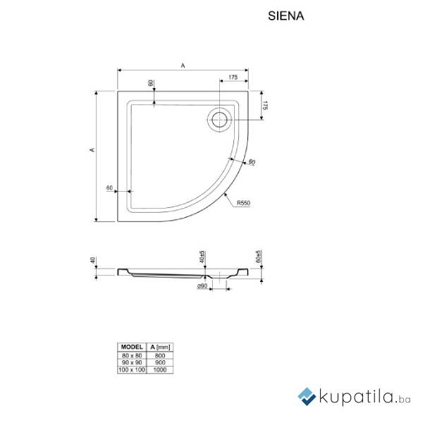 Siena je hibrid klasične i plitke kvadratne tuš kada većeg otvora sifona i smanjene dubine što ju čini elegantnom i funkcionalnom.