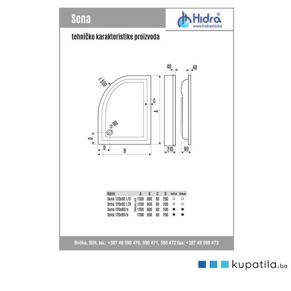 SENA je asimetrična polukružna tuš kada. Izradjuje se u desnoj i lijevoj varijanti. Ugradjuje se sa nogicama i oblogom. Sifon fi 50.